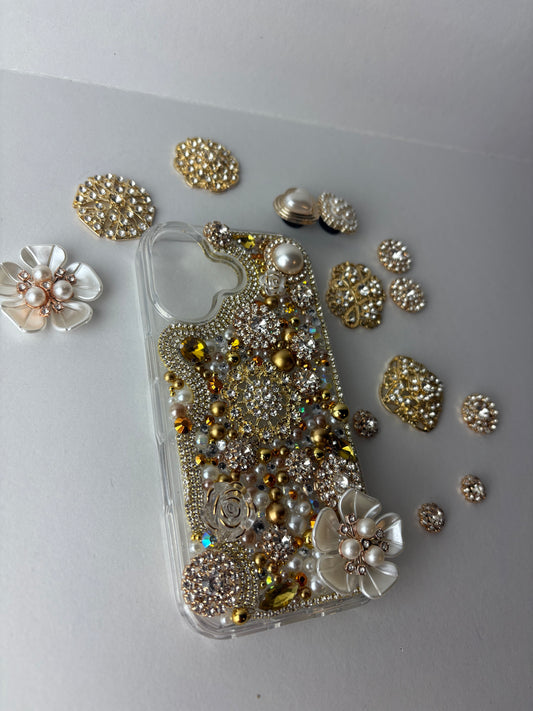 Gold Bling Phone Case | Rhinestone and Pearls Statement Case | Glam Handmade Phone Cover