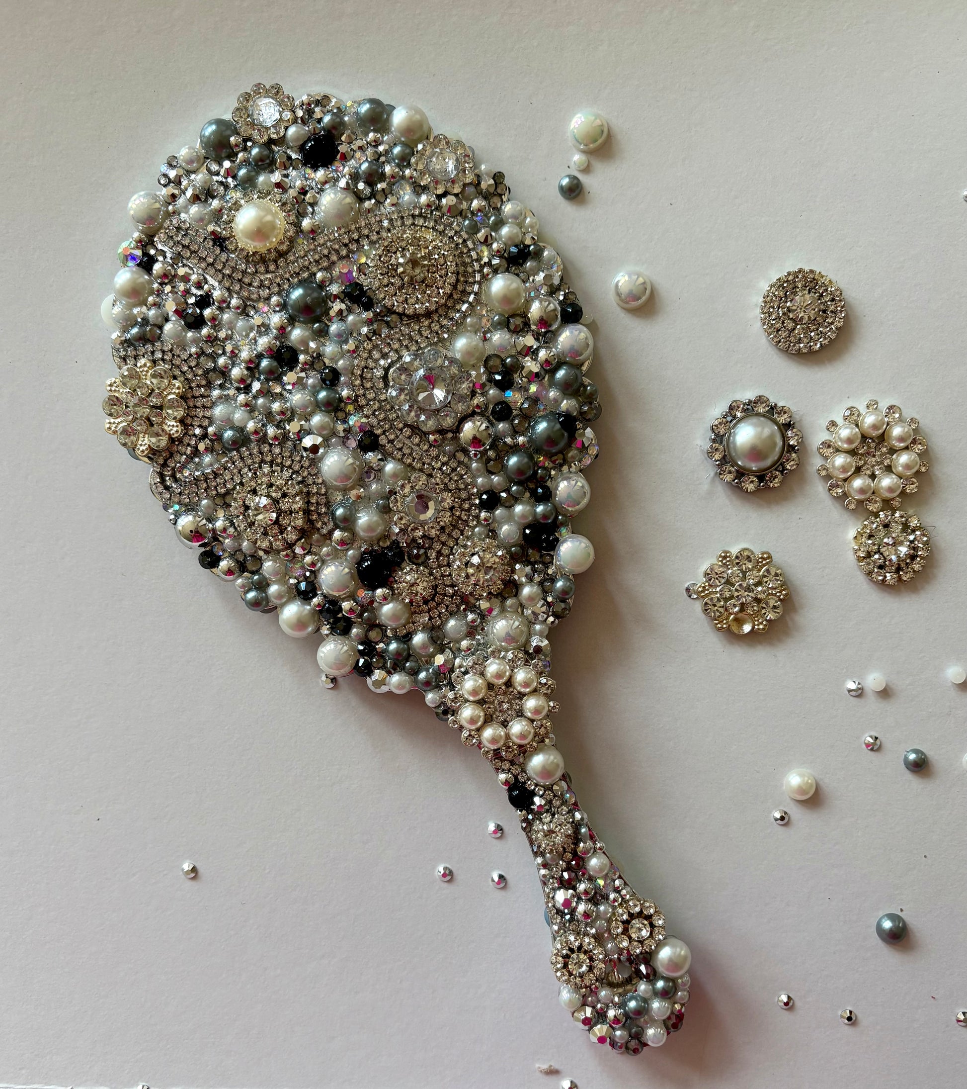 Turn your daily routine into a touch of luxury with this one-of-a-kind handmade embellished hand mirror. Carefully crafted with sparkling rhinestones, pearls, and crystal accents, this ornate mirror is both a functional accessory and a work of art.
